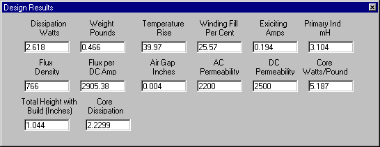 Use this data to determine if design changes are warranted: Temp Rise, Winding Fill, Excitation Amps, Flux per DC Amp can be quickly scanned to flag problems which may need correction. Change only the necessary values and re-calculate to quickly see the results of any changes. |